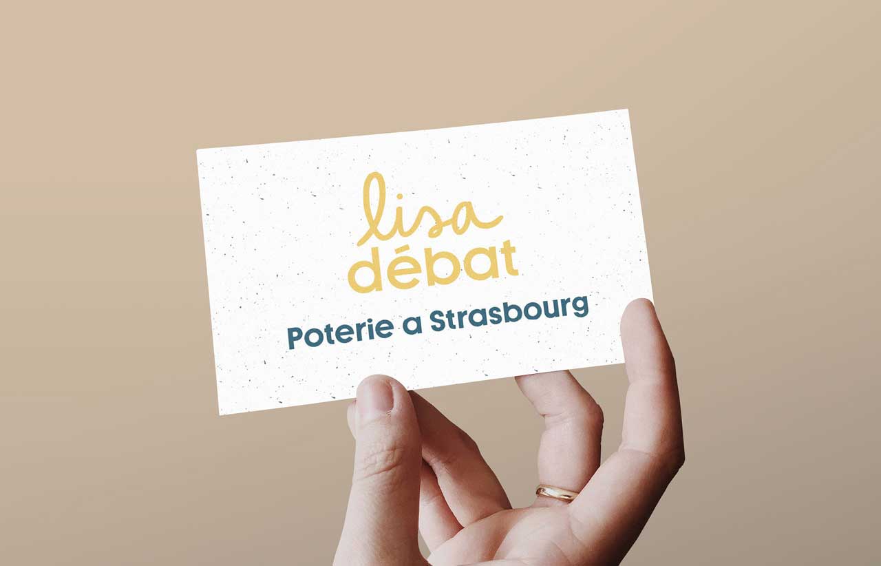 Lisa Débat est céramiste à Strasbourg. Nous avons élaboré ensemble son logo en se basant sur la signature manuscrite que Lisa grave au dos de ses céramiques. Ses croquis de travail ont servi de base pour les illustration. J'ai également créé une texture de fond rappelant l'argile pyritée qu'elle utilise, et qui donne une style caractéristique à ses créations. Pour la partie imprimée, nous utilisons un papier créé à base de déchet de l'industrie alimentaire dont la couleur reproduit naturellement l'effet moucheté du l'argile pyritée. Cela permet de ne pas imprimer de couleur de fond et donc de limiter la quantité d'encre utilisée tout en améliorant la recyclabilité du papier.