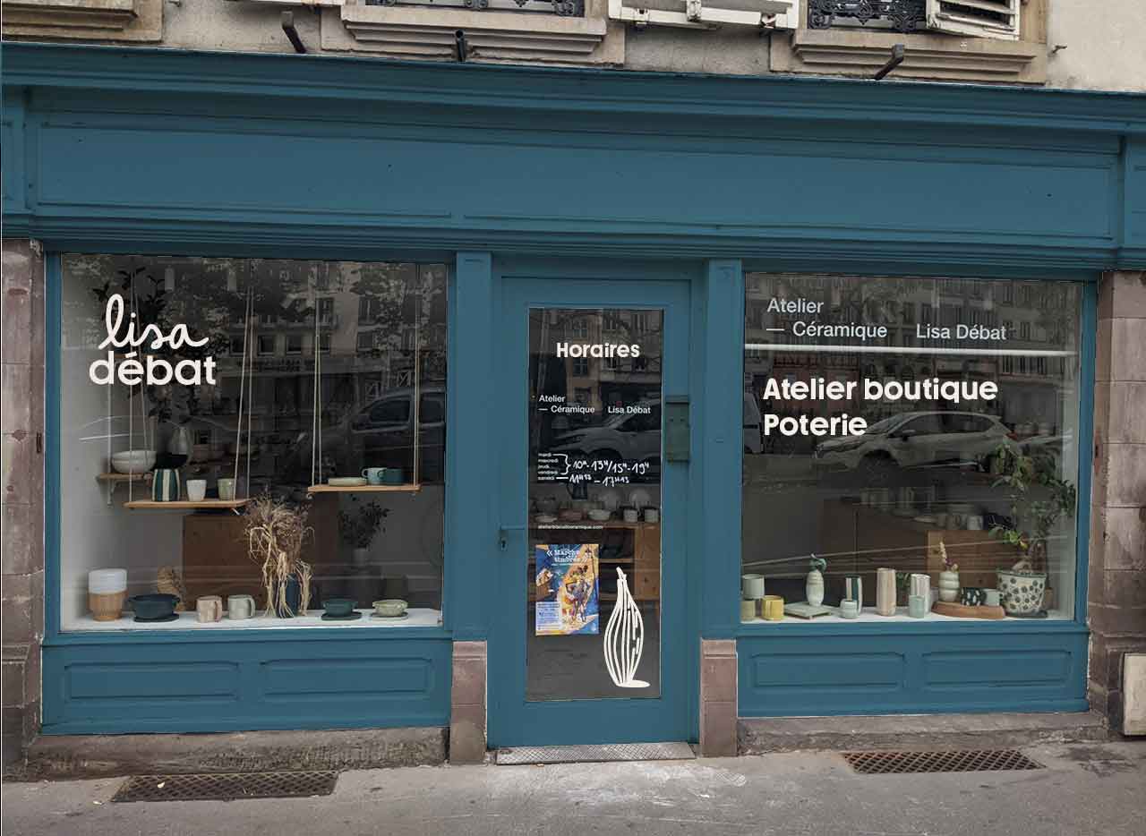Lisa Débat est céramiste à Strasbourg. Nous avons élaboré ensemble son logo en se basant sur la signature manuscrite que Lisa grave au dos de ses céramiques. Ses croquis de travail ont servi de base pour les illustration. J'ai également créé une texture de fond rappelant l'argile pyritée qu'elle utilise, et qui donne une style caractéristique à ses créations. Pour la partie imprimée, nous utilisons un papier créé à base de déchet de l'industrie alimentaire dont la couleur reproduit naturellement l'effet moucheté du l'argile pyritée. Cela permet de ne pas imprimer de couleur de fond et donc de limiter la quantité d'encre utilisée tout en améliorant la recyclabilité du papier.