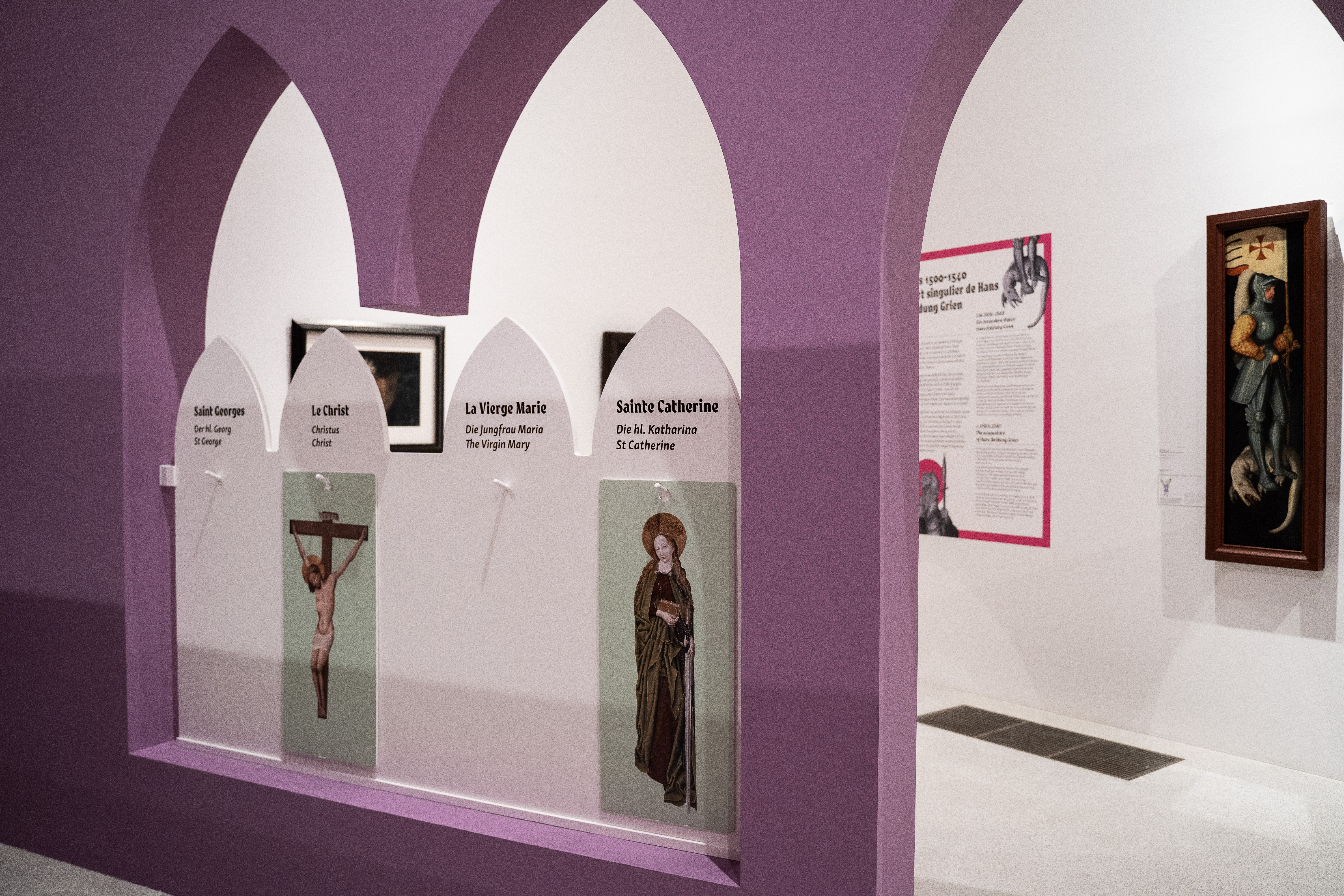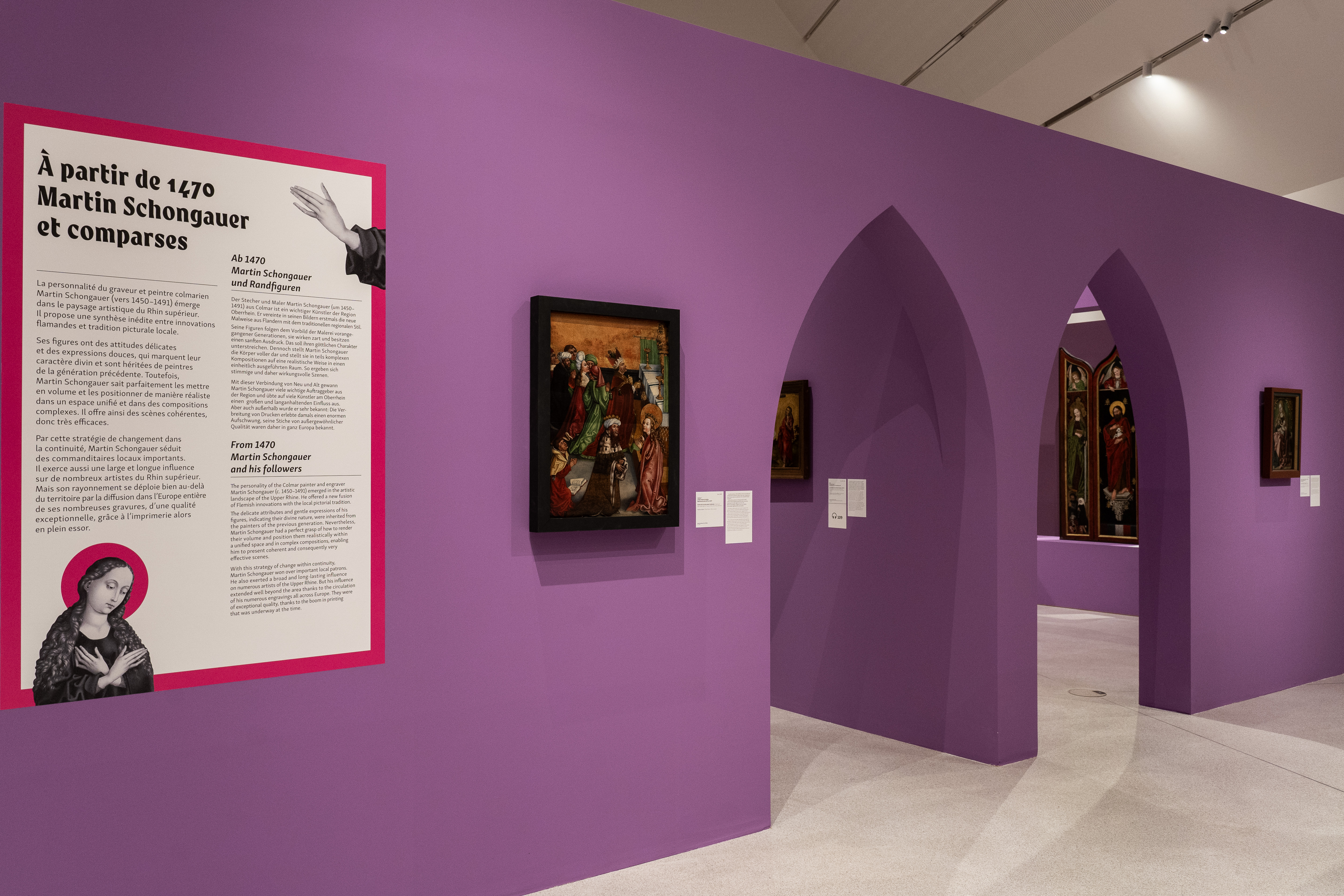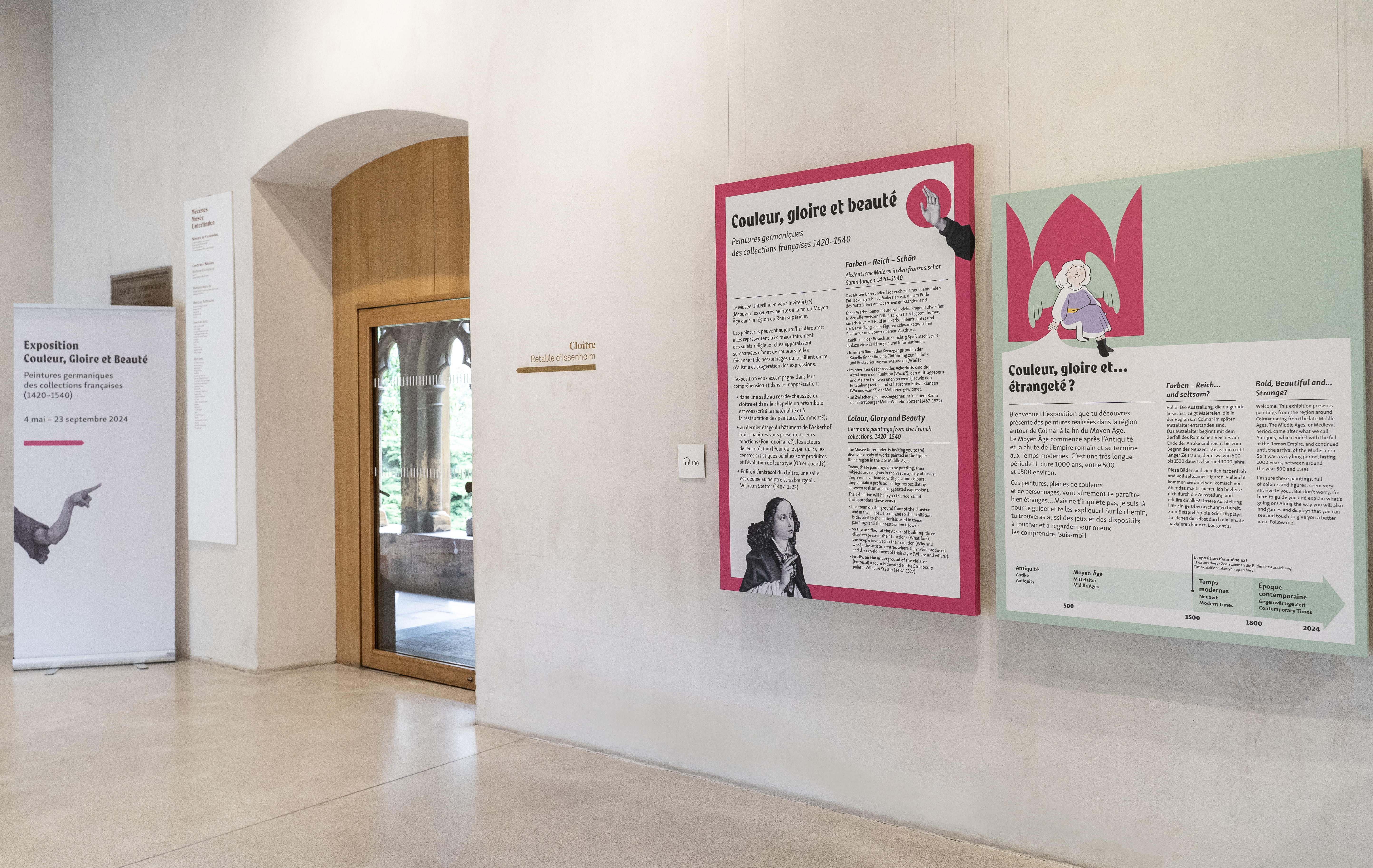 Direction artistique et création de l'identité visuelle de l'exposition Couleur, Gloire et Beauté pour le Musée Unterlinden. Le but de cette exposition était de rendre le sujet accessible à tous à travers deux parcours didactiques parallèles, proposant deux niveaux de lecture tout en gardant une unité graphique.